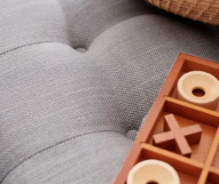 Elegant yet understated, the Avon Lake cocktail ottoman brings form and functionality to your home. A tufted top in a neutral gray upholstery is complemented by a double nailhead trim design around the edges. Completed with exposed legs and a lower storage shelf in a constrasting bittersweet chocolate finish, this classic-meets-modern ottoman makes a great addition to a living or entertaining space.