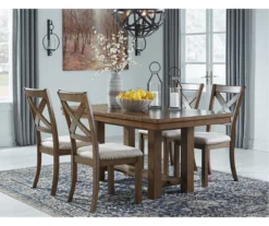 Feast your eyes on how beautiful simplicity can be. This dining room table set’s wonderfully clean-lined profile is dramatically enriched with a complex, burnished finish loaded with tonal variation and rustically refined character. Upholstered ladderback chairs are such a classic, while the addition of a comfortably cushioned bench brings a modern sensibility to the table.