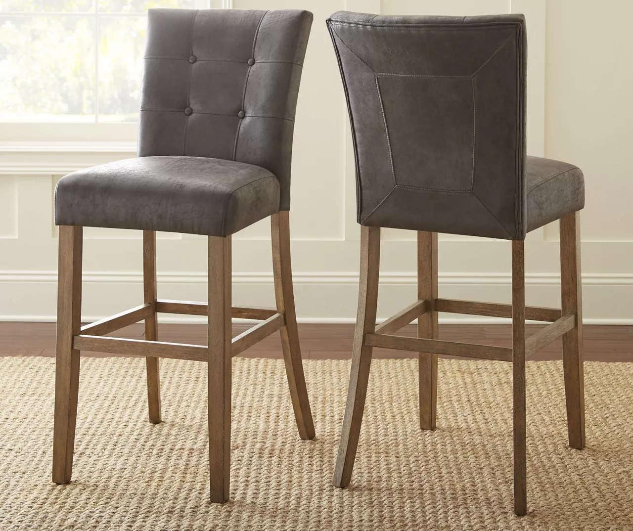 Transitional in styling, this set of Debby bar chairs feature solid hardwood construction frames in soft driftwood finishes. Their button tufted backs have comfortable memory foam seat cushions upholstered in a gray linen-look fabric.
