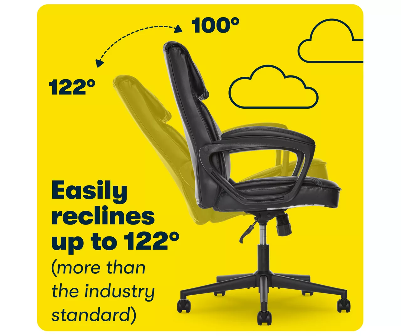 Get down to business in style with the bonded leather Hannah I office chair by Serta. With a cushioned, contemporary profile, its designed with comfort in mind with adjustable height and recline tensions. Its waterfall seat edge is curved to lessen back pressure and increase circulation. The design makes it suitable for many types of office decor, from modern to traditional. Its classic black cushions are accented by a black frame to improve any office’s decor aesthetic. The padded arms provide support and comfort, highlighting its ergonomic design. The sturdy 5-point base features castor wheels that are ideal for hard-surface floors.