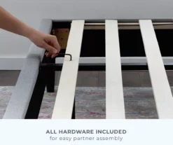 - Includes bed frame, headboard, side and foot rails, legs, 14-piece slat roll and all hardware needed for assembly