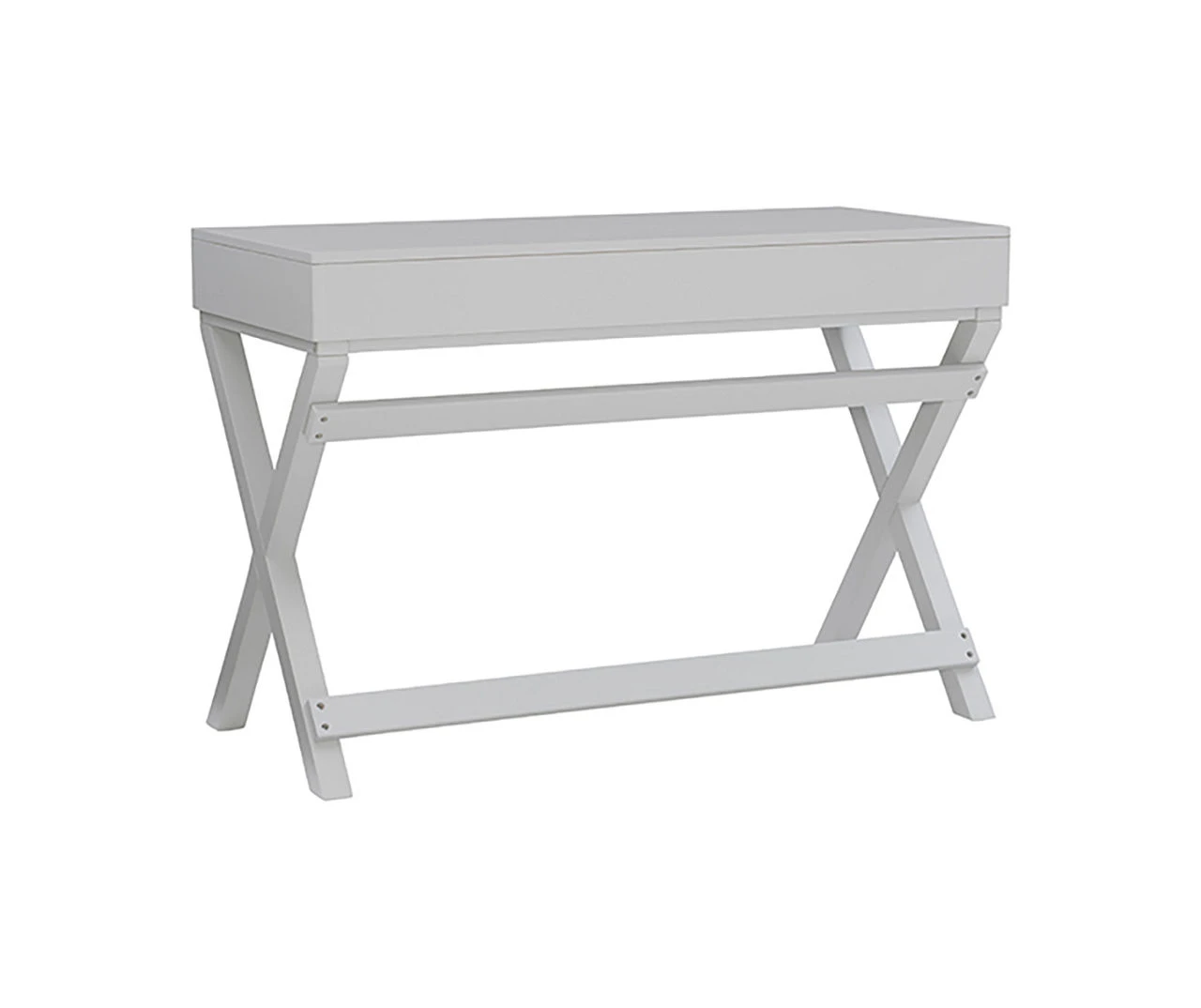 Make work fun with this campaign style writing desk. Finished in grey with silver hardware, this desk will add color and life to any space. The X-framed legs provide a study foundation for a work space, while its two drawers provide ample space for supplies.