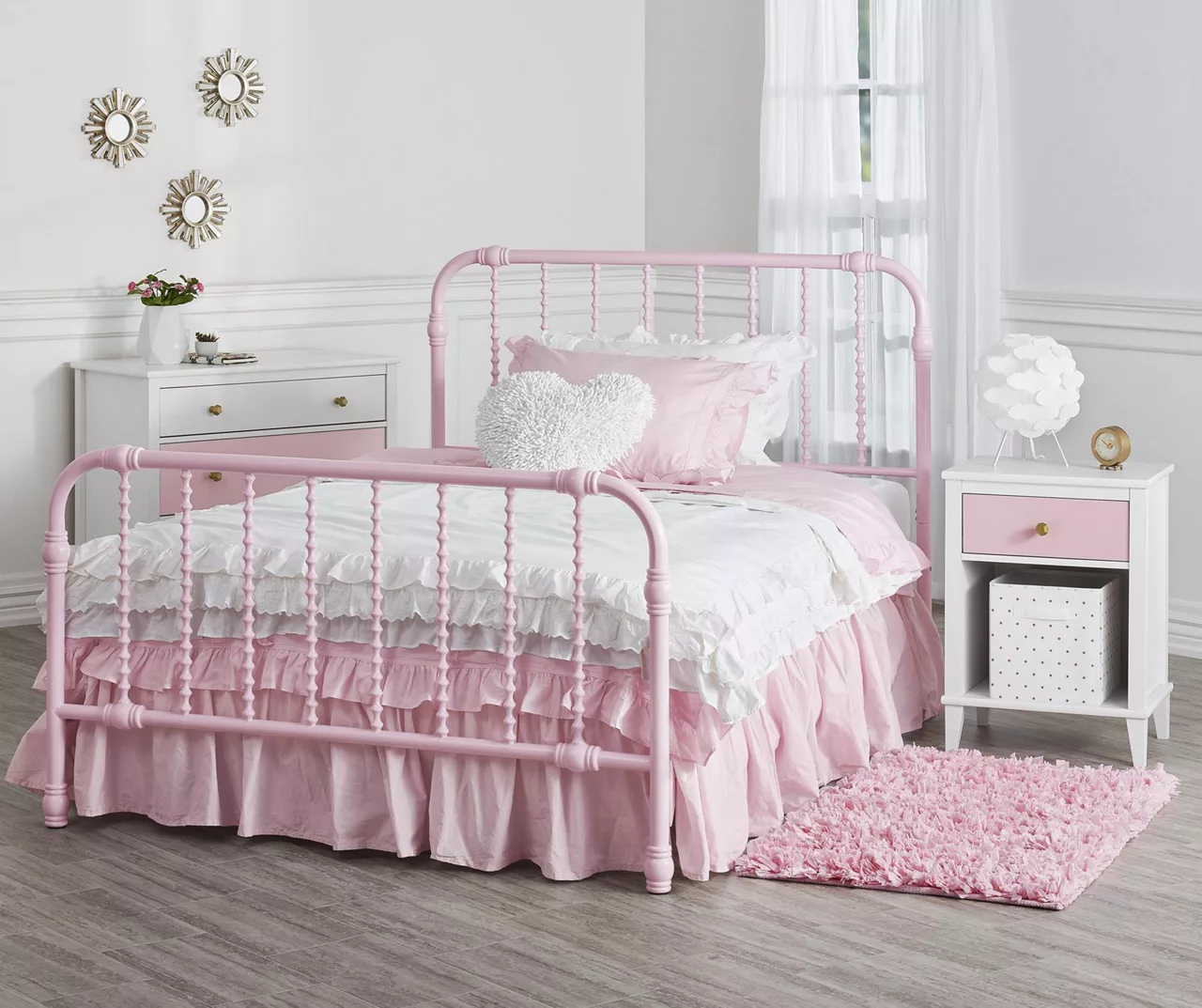 - Single drawer features a soft light pink or gray finish and stores smaller items