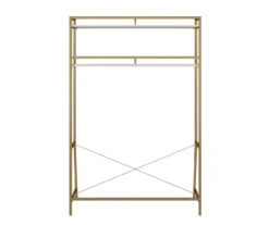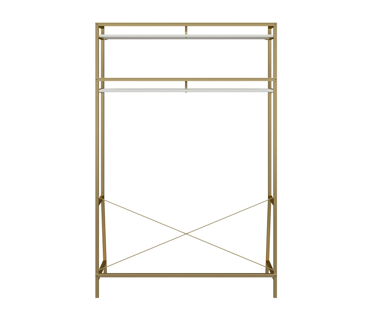 Bow down to the CosmoLiving Scarlett single pedestal desk. Designed with a modern silhouette, the pedestal desk comes in a crisp white finish. The Scarlett is built on durable gold metal legs with a roomy patterned drawer to store your things and two open shelves to obsessorize. Made with your organizational desires in mind, this desk is a match made in home office heaven.
