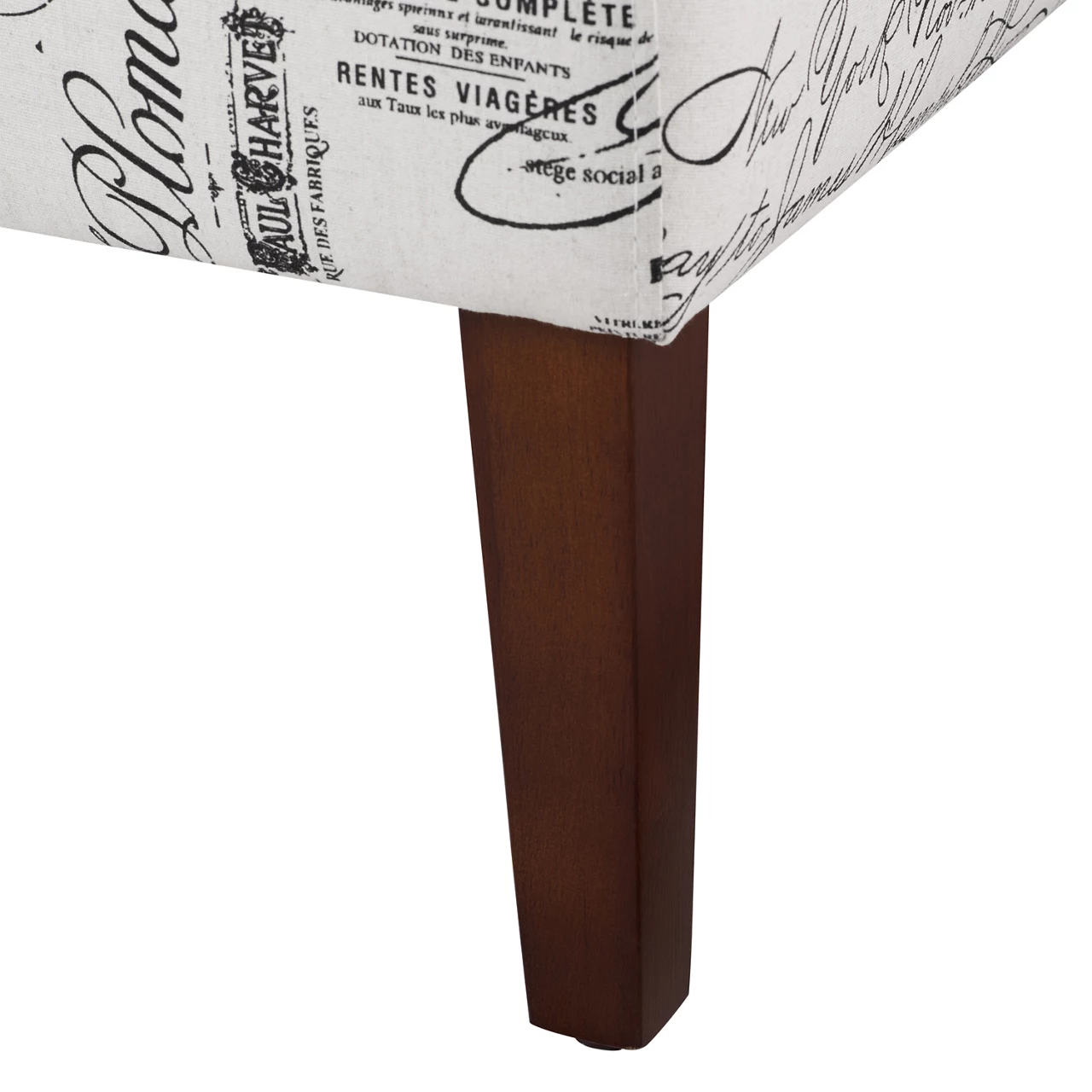 - Linen upholstered armless chair featured in decorative script